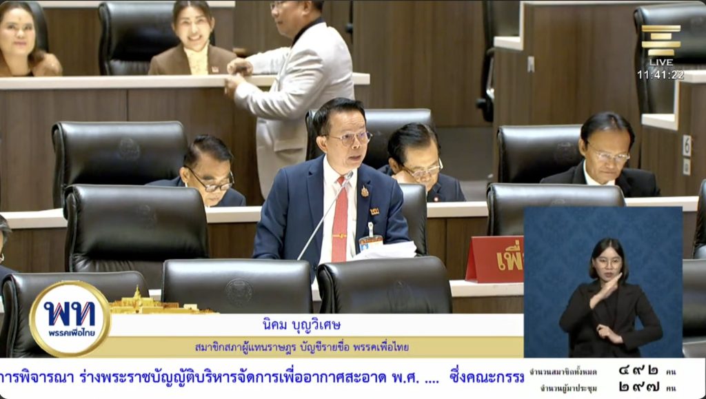 นิคม บุญวิเศษ สส. บัญชีรายชื่อ พรรคเพื่อไทย อภิปรายท้วงติงการบัญญัติถ้อยคำในมาตรา 37/15 ที่ กมธ.เพิ่มขึ้น ซึ่งระบุว่า “ในกรณีที่เป็นกิจการหรือโครงการที่ต้องได้รับอนุมัติหรืออนุญาตตามกฎหมายอื่น หรือต้องจัดทำรายงานการประเมินผลกระทบสิ่งแวดล้อม ให้คณะกรรมการอากาศสะอาดจังหวัดพิจารณา”
