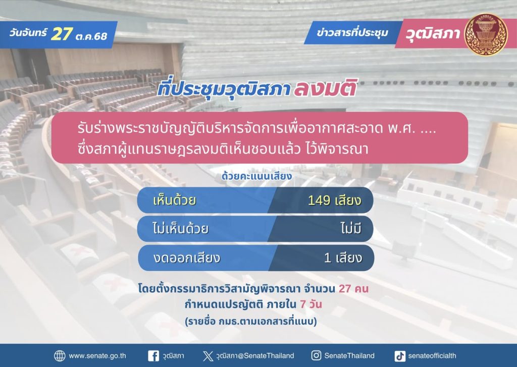 เมื่อวันที่ 27 ต.ค. 68 ที่ประชุมวุฒิสภา พิจารณาวาระรับหลักการร่างพระราชบัญญัติ (พ.ร.บ.) บริหารจัดการเพื่ออากาศสะอาด พ.ศ. …. (ร่าง พ.ร.บ.อากาศสะอาด) ซึ่งสภาผู้แทนราษฎรลงมติเห็นชอบแล้ว โดยเป็น ร่าง พ.ร.บ.เกี่ยวด้วยการเงิน วุฒิสภาต้องพิจารณาให้เสร็จภายใน 30 วัน นับแต่วันที่ร่าง พ.ร.บ. มาถึงวุฒิสภา