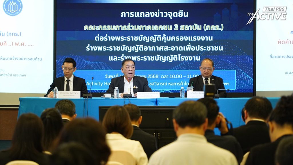 วันนี้ (12 พ.ย. 68) คณะกรรมการร่วมภาคเอกชน 3 สถาบัน (กกร.) ประกอบด้วย สภาหอการค้าแห่งประเทศไทย, สภาอุตสาหกรรมแห่งประเทศไทย และสมาคมธนาคารไทย แถลงจุดยืนต่อร่างกฎหมายสำคัญ 3 ฉบับ ได้แก่ ร่างพระราชบัญญัติคุ้มครองแรงงาน (ฉบับที่ ..) พ.ศ. …, ร่างพระราชบัญญัติบริหารจัดการเพื่ออากาศสะอาด พ.ศ. … และ ร่างพระราชบัญญัติโรงงาน (ฉบับที่ ..) พ.ศ. …