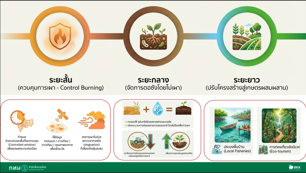 พรพรหม ยังเล่าถึง การดำเนินการ ทั้งระยะสั้น ระยะกลาง ระยะยาว ว่า ระยะสั้น คือ การสื่อสาร เพื่อควบคุมการเผา ช่วงการเผา จุดความร้อน ผ่านดาวเทียม การพยายามกรณ์ซึ่งได้เครื่องตรวจวัดคุณภาพอากาศจากจีน ที่บอกได้ด้วยว่าองค์ประกอบของฝุ่นมีที่มาอย่างไร ซึ่งสามารถนำไปแบ่งปันกับหน่วยงานที่เกี่ยวข้องได้ ระยะกลาง คือ การจัดการเผาตอซังโดยไม่เผา แต่จากการพูดคุยที่ อ.ปากพลี พบว่า การเผาเป็นวิธีที่ราคาถูกที่สุด แต่มีข้อจำกัดหลายอย่าง เช่น กทม. เสนอว่าจะสนับสนุนเครื่องจักรอัดฟาง แต่พบว่า พันธุ์ข้าวที่ปลูกมีลักษณะเหนียวไม่สามารถใช้เป็นอาหารสัตว์ได้