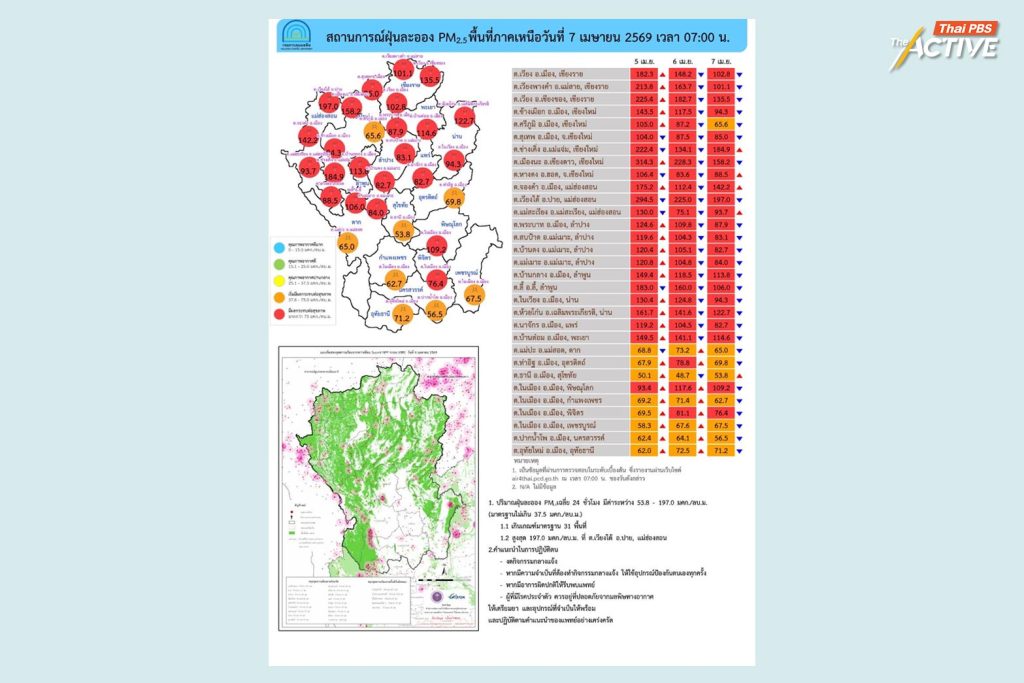 วันนี้ (7 เม.ย. 2569) ศูนย์สื่อสารการแก้ไขปัญหามลพิษทางอากาศ (ศกพ.) กรมควบคุมมลพิษ รายงานภาพรวมฝุ่น PM2.5 พบเกินค่ามาตรฐานใน จ.นนทบุรี กรุงเทพฯ สมุทรปราการ เชียงราย เชียงใหม่ น่าน แม่ฮ่องสอน พะเยา ลำพูน ลำปาง แพร่ อุตรดิตถ์ สุโขทัย พิษณุโลก ตาก กำแพงเพชร พิจิตร เพชรบูรณ์ นครสวรรค์ อุทัยธานี ชัยนาท สิงห์บุรี ลพบุรี สระบุรี อ่างทอง สุพรรณบุรี พระนครศรีอยุธยา ราชบุรี สมุทรสงคราม เพชรบุรี บึงกาฬ หนองคาย เลย อุดรธานี นครพนม หนองบัวลำภู สกลนคร มุกดาหาร ขอนแก่น กาฬสินธุ์ มหาสารคาม ร้อยเอ็ด อำนาจเจริญ ชัยภูมิ และ อุบลราชธานี