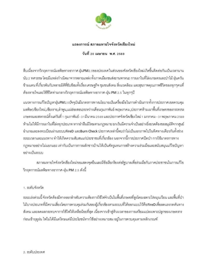 ล่าสุด สภาลมหายใจจังหวัดเชียงใหม่ และองค์กรภาคี ได้ออกแถลงการณ์ มีเนื้อหาระบุถึง วิกฤตการณ์มลพิษทางอากาศ ฝุ่น PM 2.5 ของเชียงใหม่ที่เกิดขึ้นติดต่อกันเป็นเวลานานาน นับ 2 ทศวรรษ โดยมีแหล่งกำเนิดมาจากหลายแหล่ง ทั้งภาคเมือง ขนส่ง ยานพาหนะ การเผาในที่โล่ง พื้นที่เกษตรและป่าไม้ ฝุ่นควันข้ามแดน ที่เกี่ยวพันกับหลายมิติที่ทับช้อนทั้งเรื่องเศรษฐกิจ ชุมชนสังคม สิ่งแวดล้อม และสุขภาพคุณภาพชีวิตของทุก ๆ คน ที่ต้องหายใจและใช้ชีวิตท่ามกลางวิกฤตการณ์มลพิษทางอากาศ-ฝุ่น PM 2.5 ในทุก ๆ ปี
