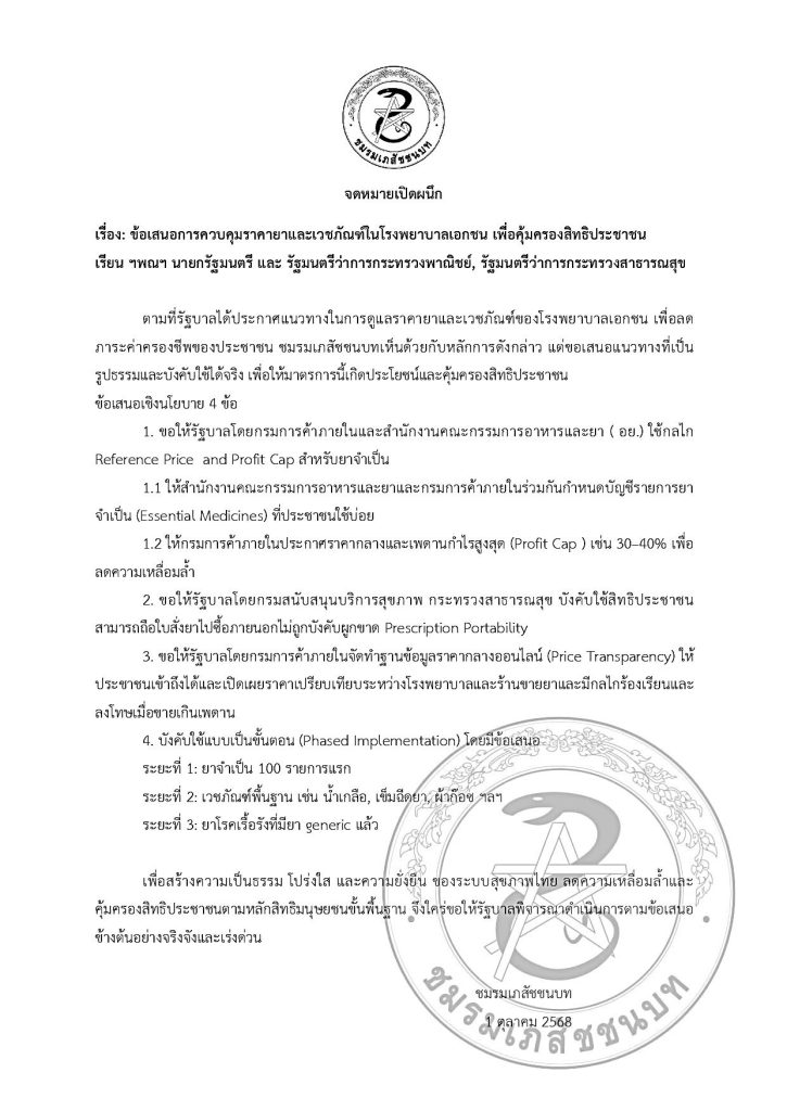 พร้อมกันนี้ ชมรมเภสัชชนบท ยังได้ออกจดหมายเปิดผนึกถึงนายกรัฐมนตรี รัฐมนตรีว่าการกระทรวงพาณิชย์ และรัฐมนตรีว่าการกระทรวงสาธารณสุข เรียกร้องให้รัฐบาลเร่งดำเนินมาตรการควบคุมราคายาและเวชภัณฑ์ในโรงพยาบาลเอกชนอย่างจริงจัง เพื่อลดภาระค่าใช้จ่ายของประชาชน และสร้างความเป็นธรรมในระบบสุขภาพ