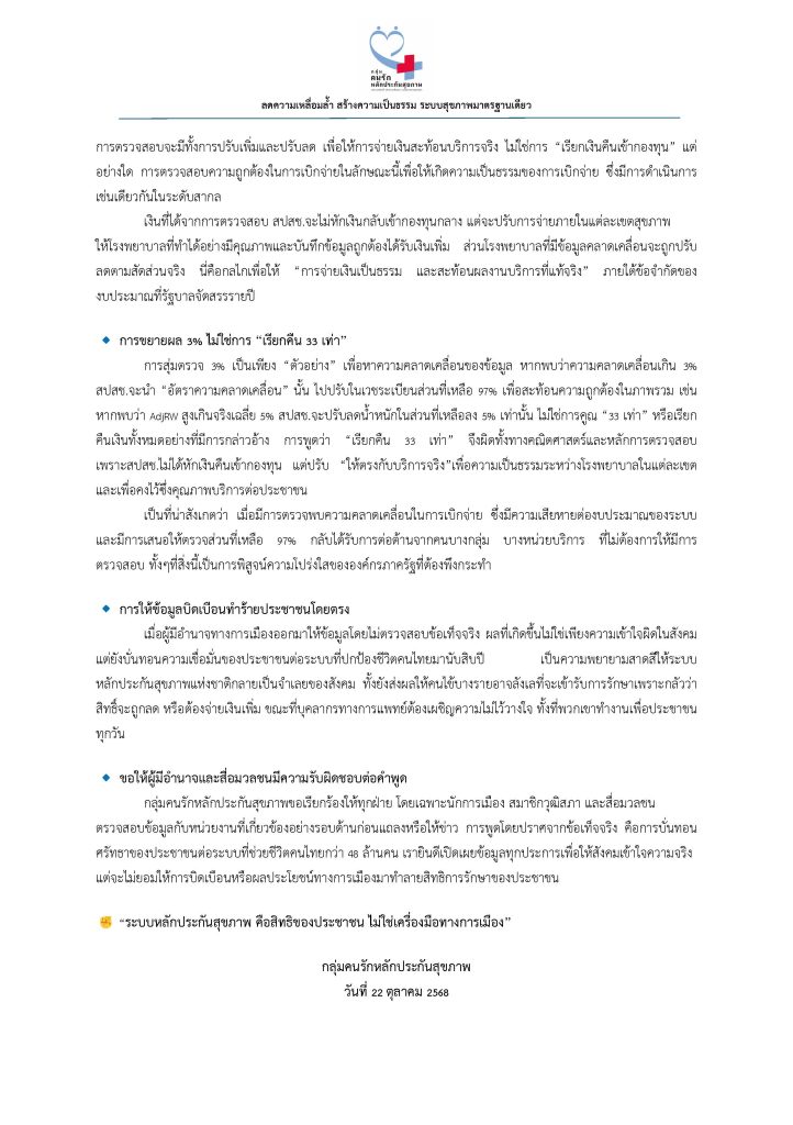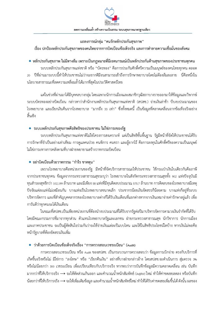 “ระบบหลักประกันสุขภาพคือสิทธิของประชาชน ไม่ใช่เครื่องมือทางการเมือง การบิดเบือนข้อเท็จจริงคือการทำร้ายคนไข้โดยตรง”