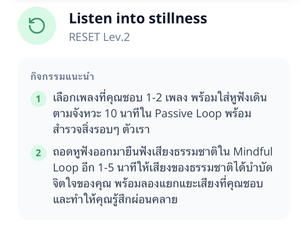 “บางคนกินอาหารดี ได้เดินวันละหลายพันก้าว แต่กลับแทบไม่เคยใกล้ชิดกับธรรมชาติเลย ใบสั่งยานี้ก็จะแนะนำให้ลองยืนฟังเสียงธรรมชาติ ลองแยกแยะเสียงที่ได้ยิน เพราะจะทำให้รู้สึกผ่อนคลาย ทั้งยังเป็นการได้ฝึกสติ และกลับมาอยู่กับตัวเอง และ reset ความคิดด้วย”