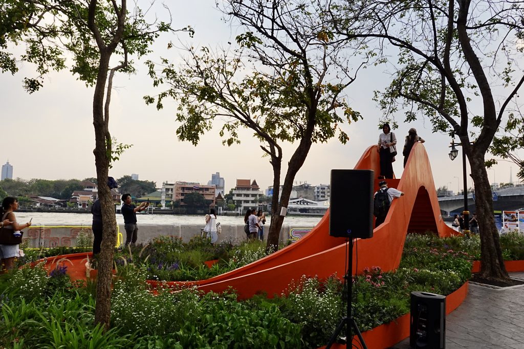 และไฮไลท์สำคัญ คือ Pop-up Park โซนพื้นที่สาธารณะสีเขียวขนาดเล็กริมแม่น้ำเจ้าพระยา ฝั่งตรงข้ามอาคารเก่าแก่อย่าง ไปรสนียาคาร จุดเชื่อมต่อของย่านทรงวาด สวนพระปกเกล้า และปากคลองตลาด