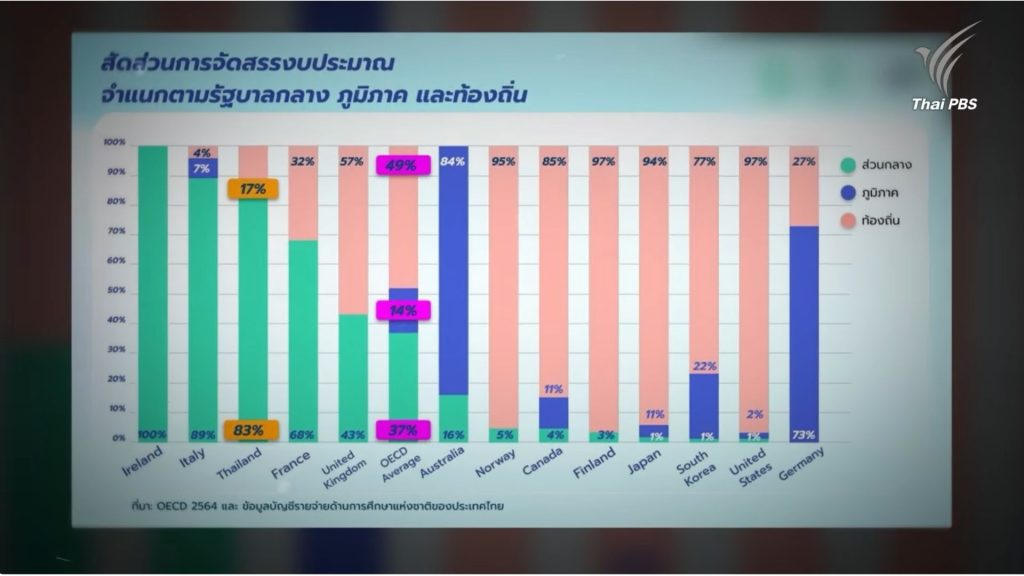 แต่เมื่อเทียบกับกลุ่มประเทศที่พัฒนาและได้รับการยอมรับว่ามีระบบการศึกษาที่ดี ไม่ว่าจะเป็น ฟินแลนด์ นอร์เวย์ แคนาดา หรือญี่ปุ่น จะเห็นว่างบประมาณส่วนใหญ่ถูกจัดสรรให้ท้องถิ่น เนื่องจากมีความยืดหยุ่นในการใช้งบประมาณกว่า