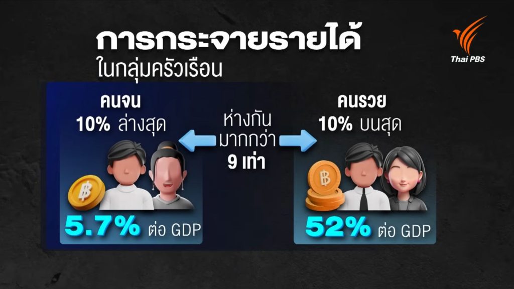 ในแง่การกระจายรายได้ พบว่า กลุ่มครัวเรือนที่มีรายได้ต่ำ 10% ล่างสุด มีสัดส่วนรายได้เพียง 5.7% ของทั้งประเทศ ขณะที่กลุ่มที่มีฐานะดี 10% บนสุด ถือครองรายได้มากกว่า 52% ของทั้งประเทศ ซึ่งห่างกันมากกว่า 9 เท่า