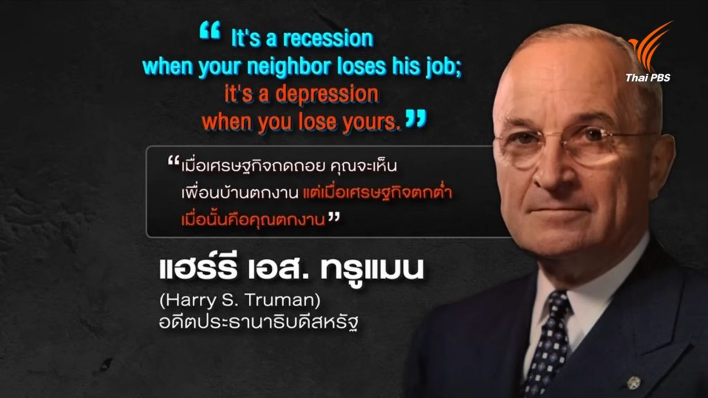 “คําว่าวิกฤตคืออะไร นักเศรษฐศาสตร์ก็บอกว่ามันเกิดขึ้นเมื่อระบบเศรษฐกิจไม่สามารถฟื้นตัวได้เอง ต้องมีกลไกมาช่วย Harry S. Truman ประธานาธิบดีเก่าของอเมริกา เคยพูดขํา ๆ เอาไว้ว่าเมื่อไหร่ก็ตามที่เศรษฐกิจถดถอย เมื่อนั้นคุณจะเห็นเพื่อนคุณตกงาน แต่ถ้าเกิดเศรษฐกิจตกต่ำขั้นวิกฤต วันนั้นคือคุณตกงานเอง”