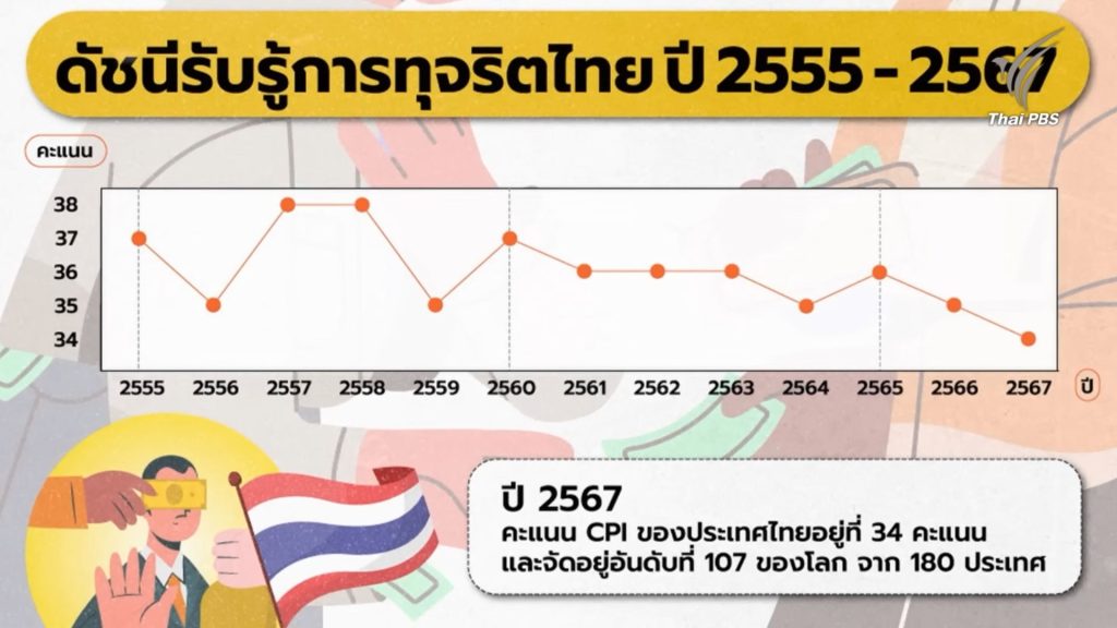 ข้อมูลข้างต้น คือ ผลการสำรวจดัชนีรับรู้การทุจริต Corruption Perceptions Index (CPI) ขององค์กรเพื่อความโปร่งใสนานาชาติ Transparency International (TI) จากการสำรวจ 180 ประเทศทั่วโลก โดยจะเห็นว่าเมื่อย้อนผลสำรวจ 10 ปีที่ผ่านมา ประเทศไทยมีคะแนนและอันดับที่แย่ลง ซึ่งสะท้อนให้เห็นถึง ปัญหาคอร์รัปชันที่มากขึ้น