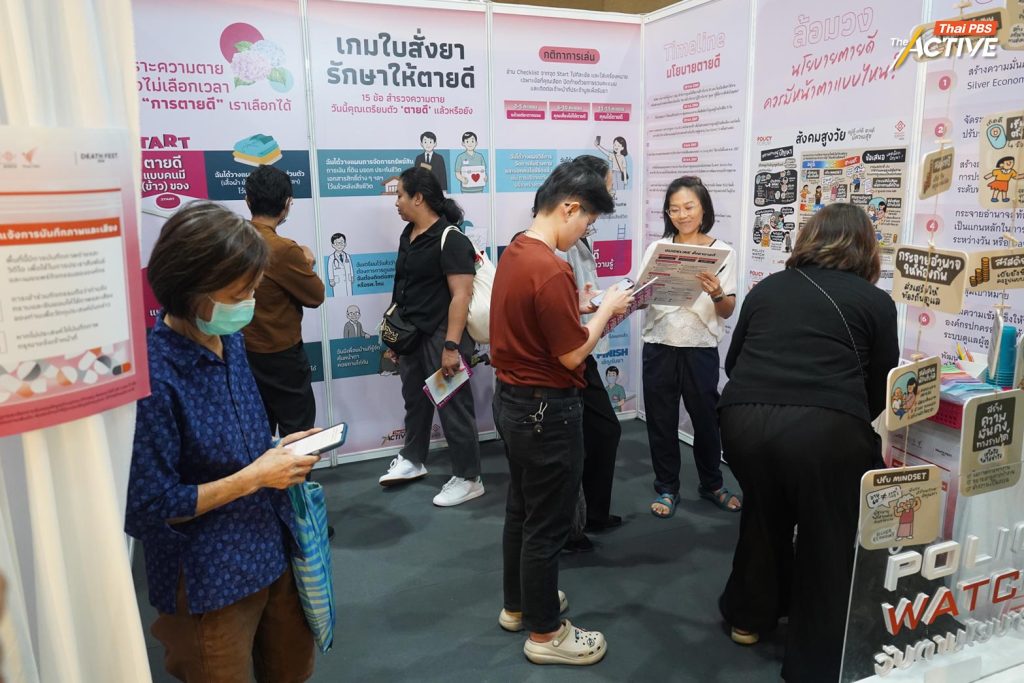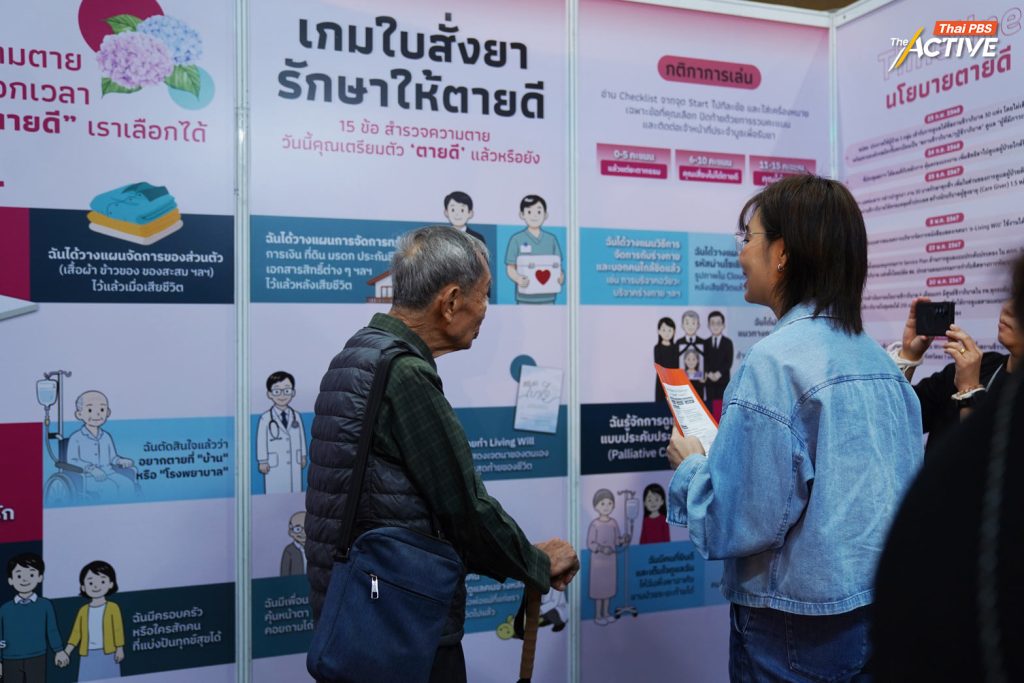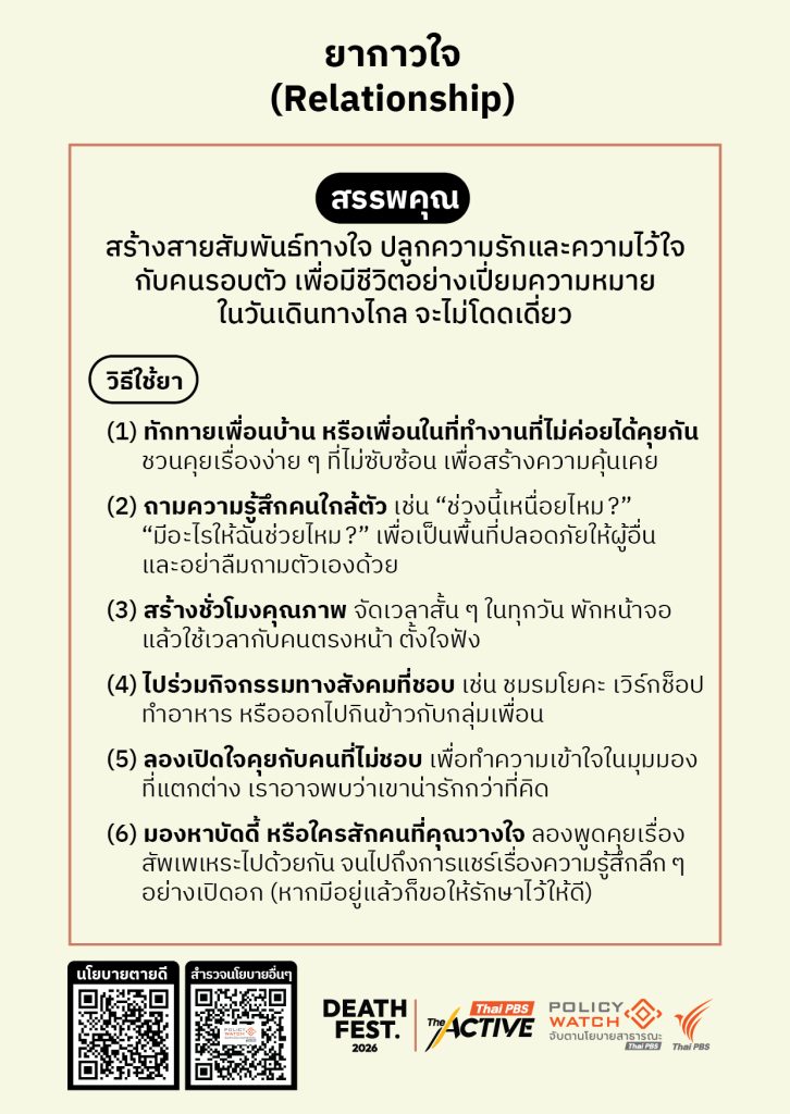- ทำความรู้จักกับ “การดูแลแบบประคับประคอง” (Palliative Care) สามารถหาข้อมูลเพิ่มเติมได้ที่ Peaceful Death แหล่งรวมบทความ เครื่องมือ (เช่น สมุดเบาใจ) และวิดีโอสร้างความตระหนักรู้เรื่องการเผชิญความตายอย่างสงบ