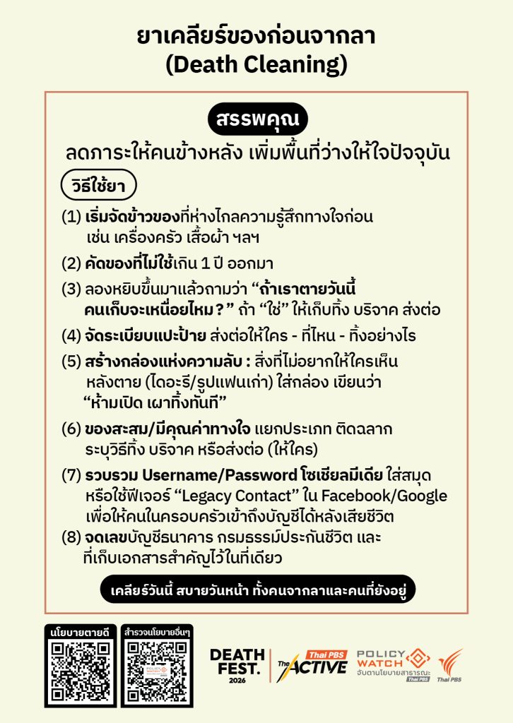 แต่อย่างน้อย การได้เริ่มเตรียมจากตัวเราในวันที่ยังมีชีวิต นอกจาก จะช่วยลดภาระให้กับคนข้างหลังแล้ว สิ่งสำคัญที่สุดคือการช่วยให้ตัวเราได้กลับมาทบทวนระหว่างการใช้ชีวิต ว่าแท้จริงแล้ว ท่ามกลางสิ่งของมากมายระหว่างทาง อะไรคือสิ่งใดที่มีคุณค่าและมีความหมายกับเราอย่างแท้จริง