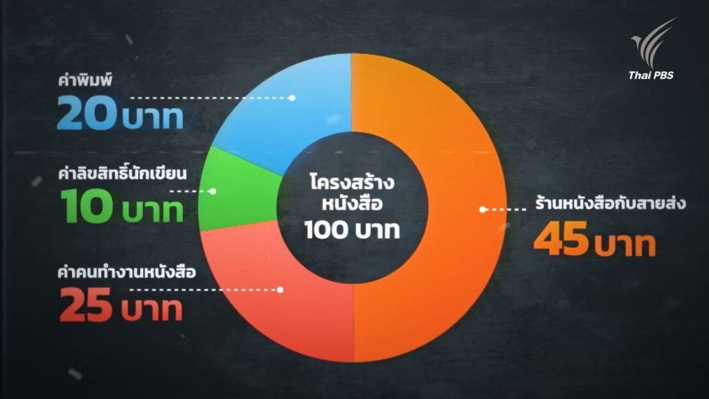 ในยุคเฟื่องฟูของหนังสือ มีร้านแบรนด์ใหญ่ มีผู้คุมตลาด และสายส่ง ซึ่งหากดูโครงสร้างราคาหนังสือ ในราคาปก 100 บาท จะพบว่า