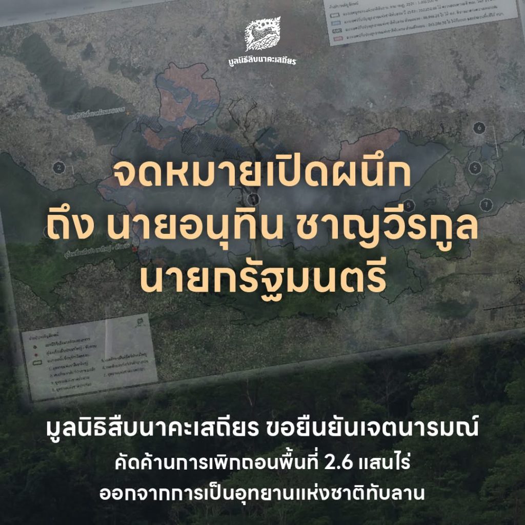 จดหมายเปิดผนึกที่ มูลนิธิสืบนาคะเสถียร ยื่นถึง อนุทิน ชาญวีรกูล นายกรัฐมนตรี ย้ำจุดยืนคัดค้านการเพิกถอนพื้นที่อุทยานแห่งชาติทับลาน เนื้อที่ 265,286 ไร่ ออกจากการเป็นอุทยานแห่งชาติทับลาน เพื่อแก้ไขปัญหาข้อพิพาทที่ดินชุมชน นับเป็นช่วงจังหวะเวลาที่ คณะทำงานพิจารณาเสนอแนวทางเกี่ยวกับประเด็นร้องเรียนกรณีการรับฟังความคิดเห็นและการมีส่วนร่วมของผู้มีส่วนได้เสียในการกำหนดเขตพื้นที่อุทยานแห่งชาติทับลาน ภายใต้ คณะอนุกรรมการอิสระเพื่อศึกษากำหนดแนวทางมาตรการเร่งรัดการปรับปรุงแนวเขตที่ดินของรัฐ (ONE MAP) ซึ่งมี รศ.ธนพร ศรียากูล เป็นประธาน