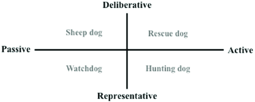 จากภาพข้างต้น แสดงให้เห็นว่ามี 4 ตัวแปร ทั้งทิศทาง ซ้ายขวา (Passive-Active) และ ขึ้นลง (deliberative-representative)