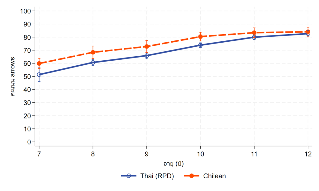 นอกจากนี้ รศ.วีระชาติ ยังเปิดเผยผลการวิเคราะห์ข้อมูลอีกชุดหนึ่ง นั่นคือ การประเมินทักษะการคิดเชิงบริหาร (EF) โดยใช้ Yellow-Red application ที่พบว่า แม้ค่าเฉลี่ยของผลการทดสอบเพิ่มสูงขึ้นเมื่อกลุ่มตัวอย่างเรียนสูงขึ้น แต่หากเจาะลึกไปที่ ทักษะด้านการคิดยืดหยุ่น (cognitive flexibility) คะแนนของเด็กไทยกลุ่มตัวอย่าง มีค่าต่ำกว่าโดยเปรียบเทียบ การประเมินนี้ใช้การทดสอบผ่านเกม โดยในเกม Arrow ซึ่งเป็นเกมที่มีเป้าหมายเพื่อประเมินทักษะการยั้งคิดไตร่ตรอง (inhibition) นั้นไม่น่าเป็นห่วงมากนัก แต่ในส่วนของเกม Triads ซึ่งเป็นเกมที่มีเป้าหมายเพื่อประเมินทักษะด้านการคิดยืดหยุ่น (cognitive flexibility) กลับพบว่า คะแนนของเด็กไทยกลุ่มตัวอย่าง มีค่าต่ำกว่าเด็กชิลี มากขึ้นตามระดับชั้นอย่างชัดเจน ซึ่งอาจเป็นไปได้ว่า การศึกษาไทยสามารถพัฒนาทักษะด้านการคิดยืดหยุ่นให้กับผู้เรียนได้น้อยกว่าระบบการศึกษาของประเทศชิลี