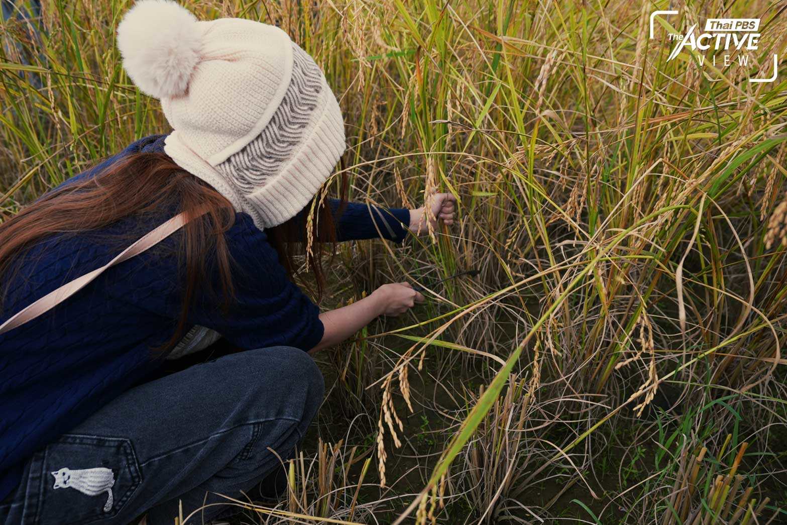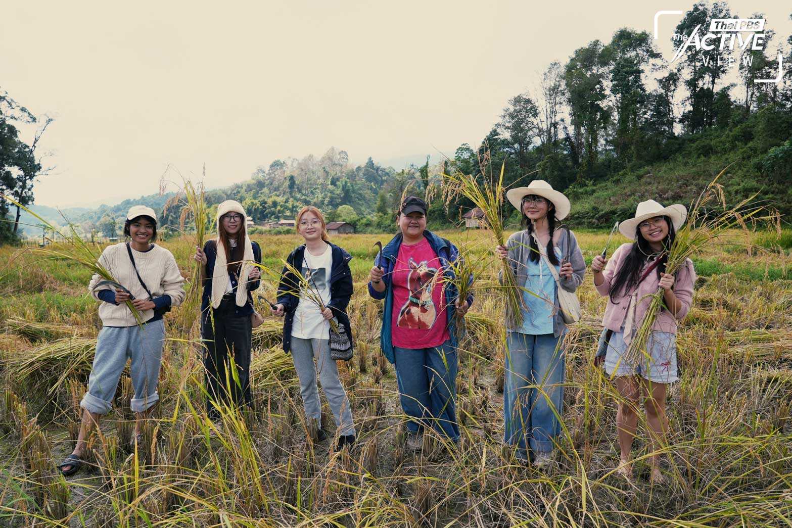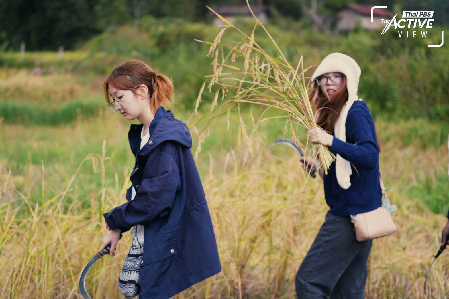 วันนี้นักศึกษาจึงได้ลอง “เกี่ยวข้าว” เป็นครั้งแรกในชีวิต แทบทุกคนไม่เคยจับเคียว ชาวบ้านจึงต้องคอยแนะนำทีละขั้นตอน การได้สัมผัสวิถีนาบนที่สูง ทำให้เด็กต่างจังหวัดบางคนย้อนนึกถึงอาชีพดั้งเดิมของคนรุ่นปู่ย่าตายาย แม้ในรุ่นของพวกเขาแทบจะไม่เคยได้ร่วมทำนาแล้ว ส่วนบางคนก็ไม่เคยแม้แต่เดินบนคันนา การได้มาเกี่ยวข้าววันนี้ จึงกลายเป็นประสบการณ์ตรง ที่ไม่มีอยู่ในหนังสือเล่มไหน